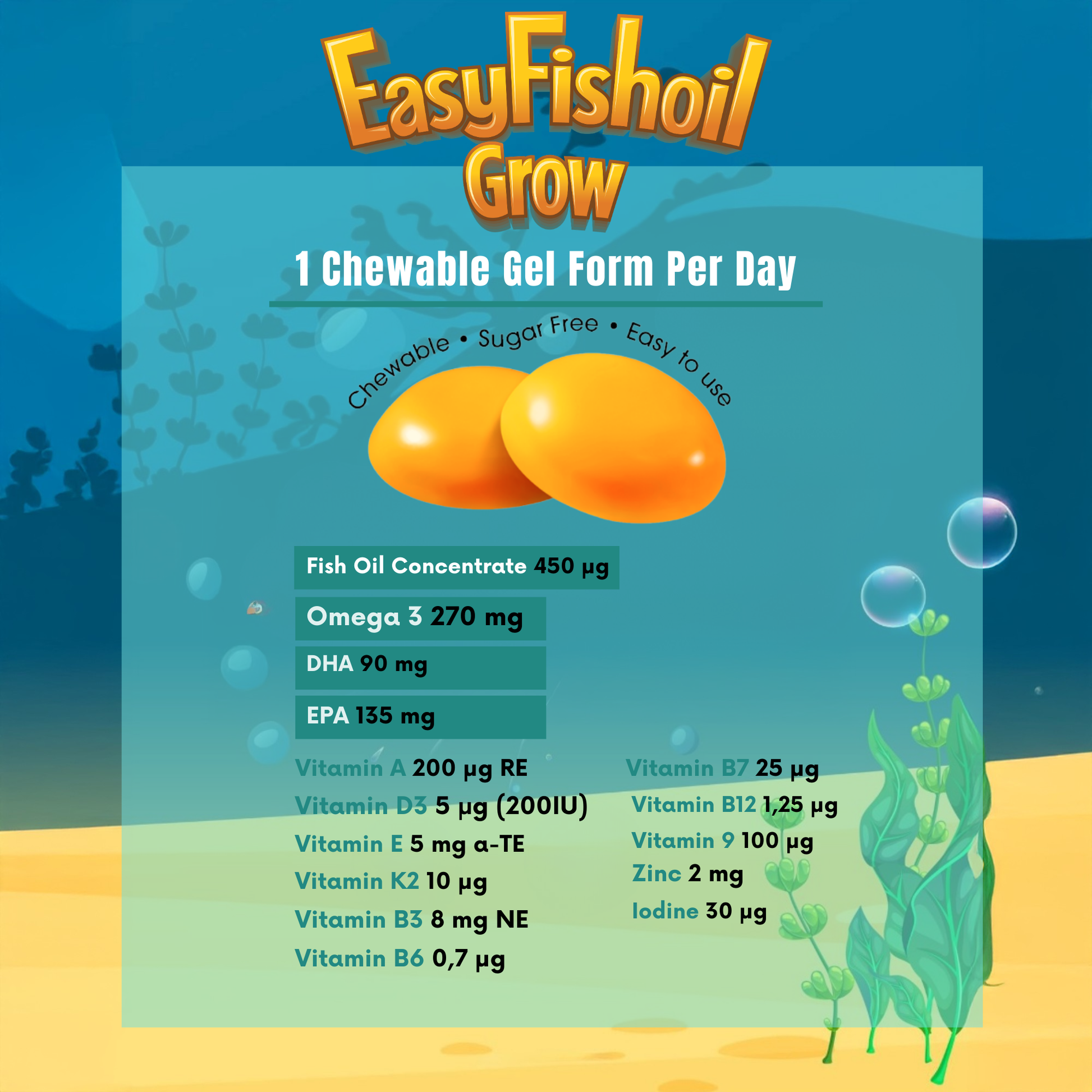 EasyFishoil Grow is a scientifically formulated chewable gel supplement designed to support the daily nutritional needs of children aged 3 and above. It combines Omega-3 fatty acids (EPA and DHA) with a broad spectrum of essential vitamins and minerals that contribute to healthy growth, immune support, cognitive development, and bone strength — all in a fruity, child-friendly format.